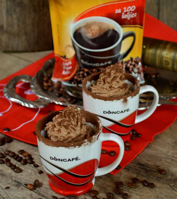 Potrebno je 200 grama čokolade za kuvanje, tri kašičice Donkafe instant kafe, četiri kašike konjaka, 500 mililitara slatke pavlake, 20 grama učvršćivača za šlag, dve kašike šećera i kakao za ukrašavanje. Ovo je dovoljna količina za šest osoba.